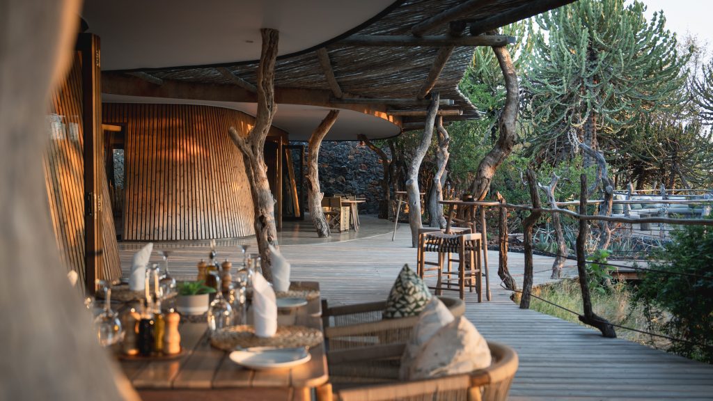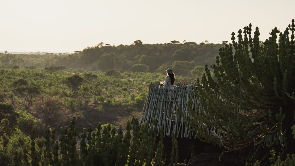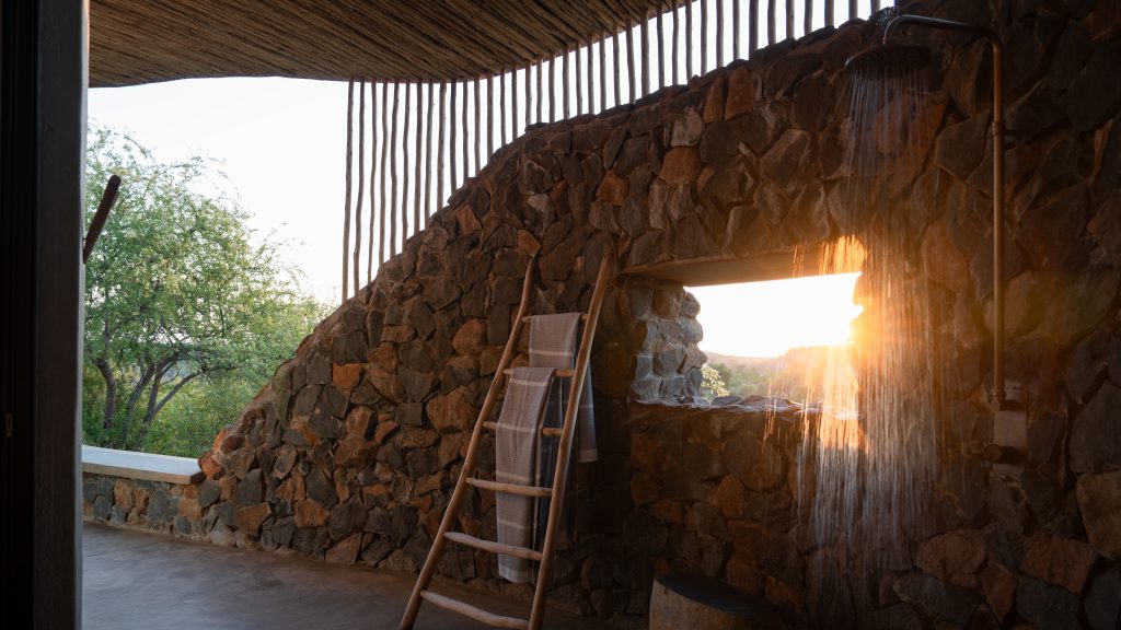 Euphorbia Mashatu embraces sustainable tourism, minimising its environmental footprint through eco-friendly design and operation and the use of solar power. The eight villas, inspired by the shape of the mopane tree pod, are built using natural materials that blend seamlessly into the landscape. I love the ruggedness of locally sourced stone exteriors, the outdoor shower with its viewing window and the second ‘loo with a view,’ which makes for an unforgettable bathroom break.