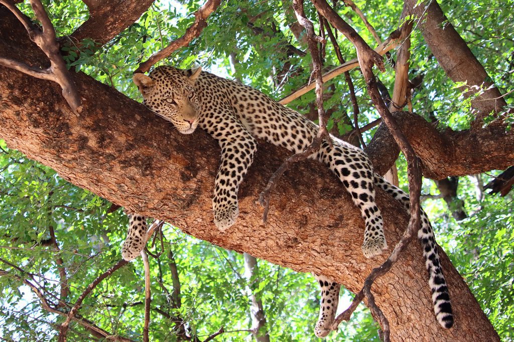 Mashatu is renowned for its leopard sightings, and the reserve doesn’t disappoint. On one drive, we have three unforgettable encounters – a young male strolls across the riverbed, another naps under a knobby combretum, and two more lounge in the branches of a Mashatu tree.